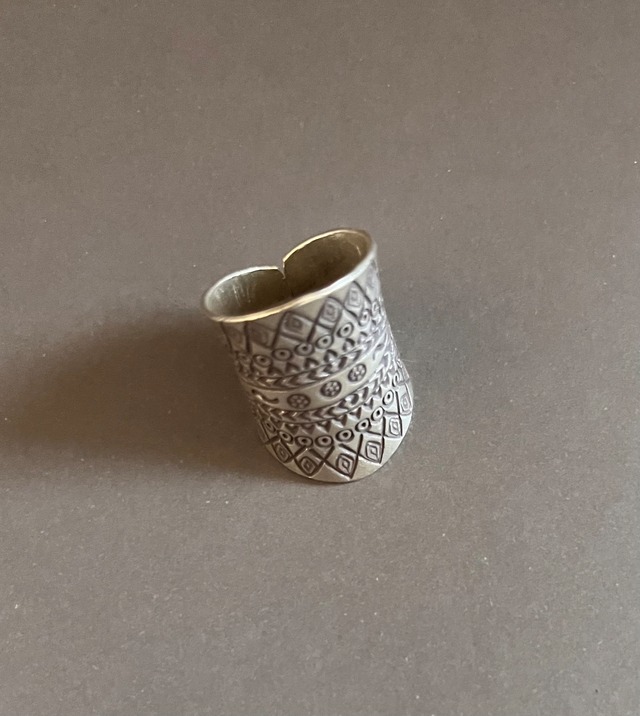 タイ北部・山岳民族カレン族によって作られた、伝統文様が全面に刻まれたシルバーリング。 純度が高いとされるカレンシルバーは、 やわらかく深みのある輝きを放ちます。 一つひとつ手打ちで刻まれた文様は、 装飾でありながら、祈りや守りの意味を持つもの。 均一ではない揺らぎや歪みも、手仕事ならではの魅力です。 フリーサイズ・調整可能な仕様のため、 指に合わせて自然にフィットし、 その日のスタイリングに合わせた着用も楽しめます。 存在感のあるデザインながら、 身につけるほどに肌になじみ、 持ち主の時間とともに育っていく一点です。