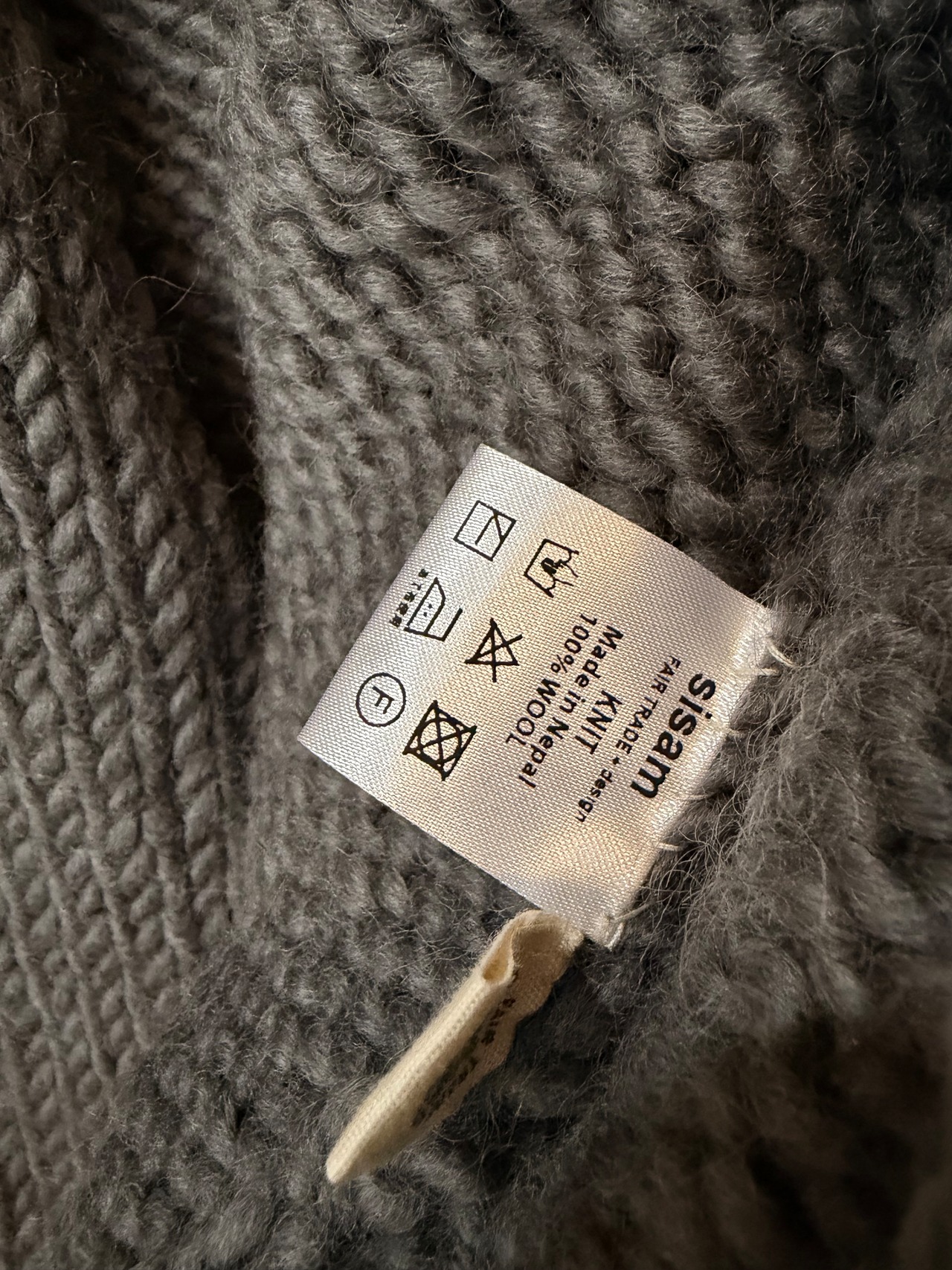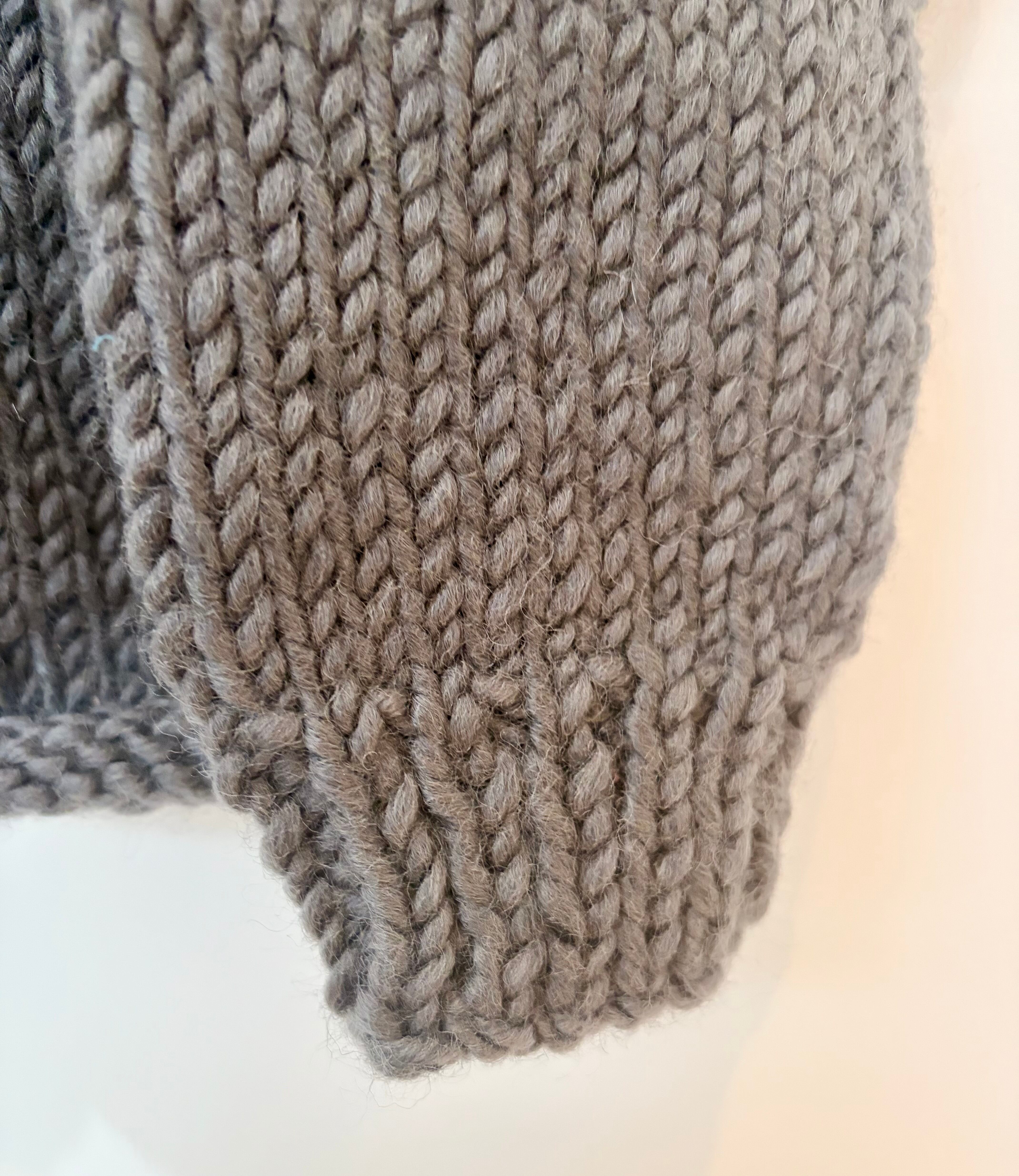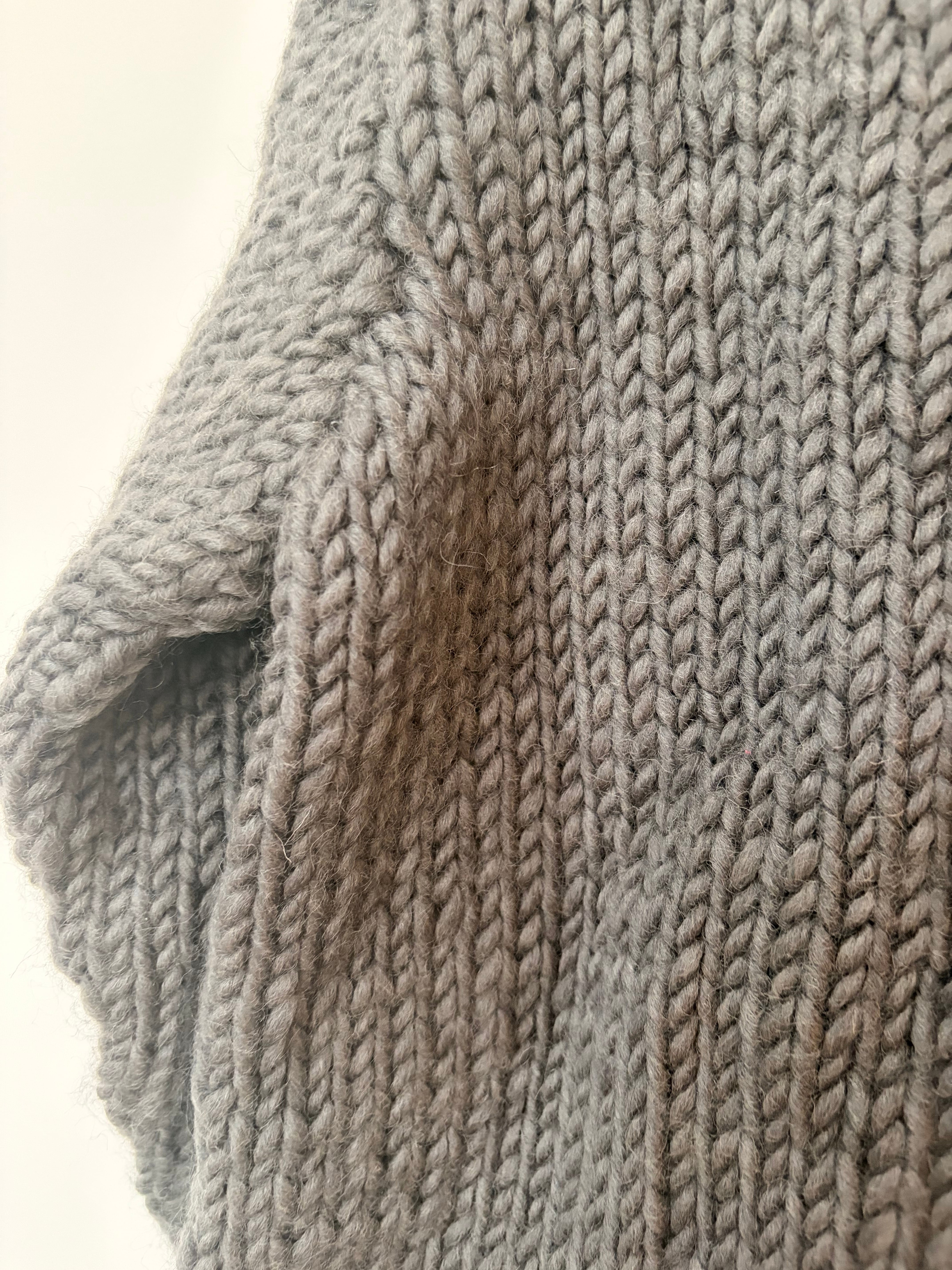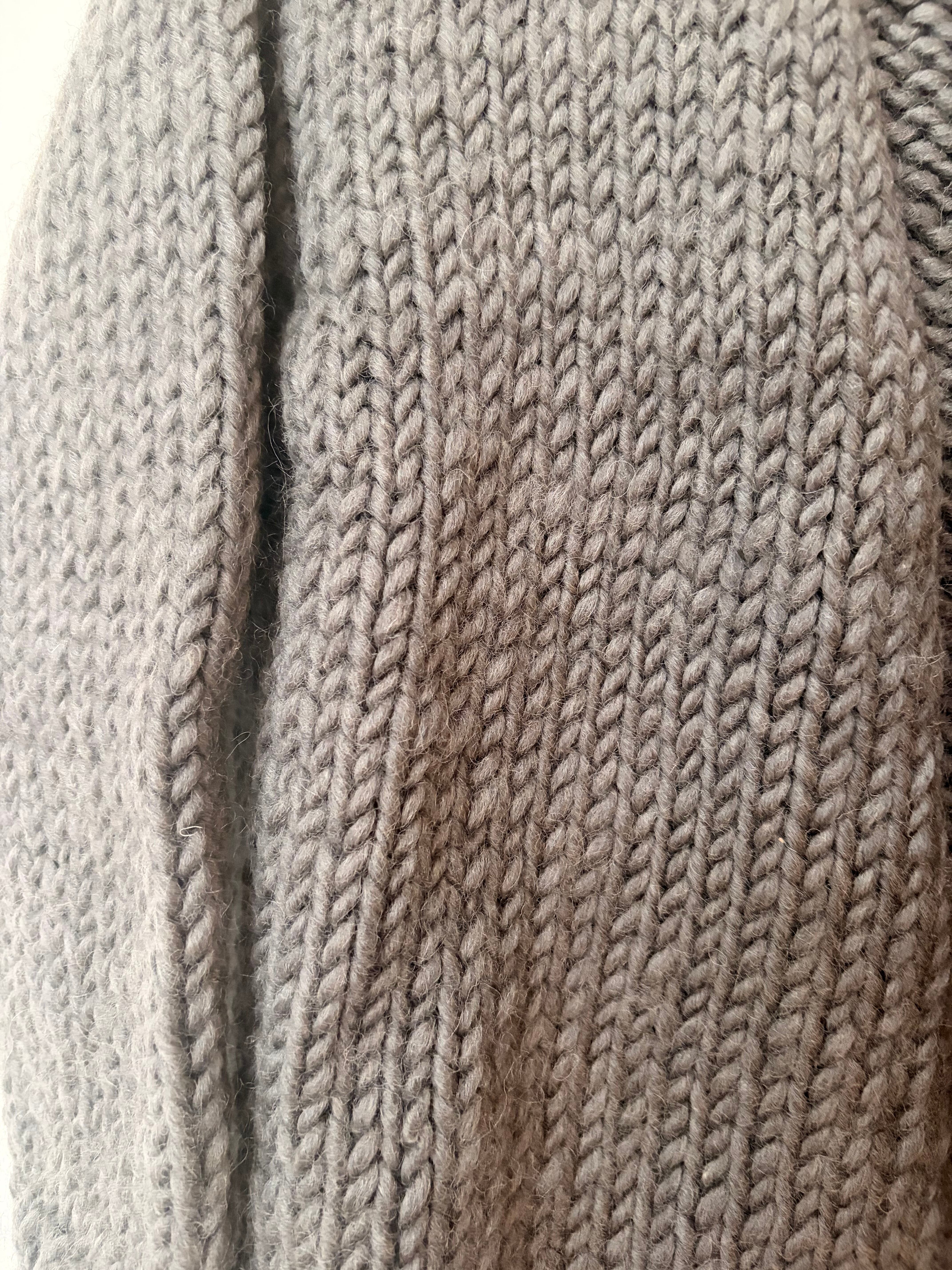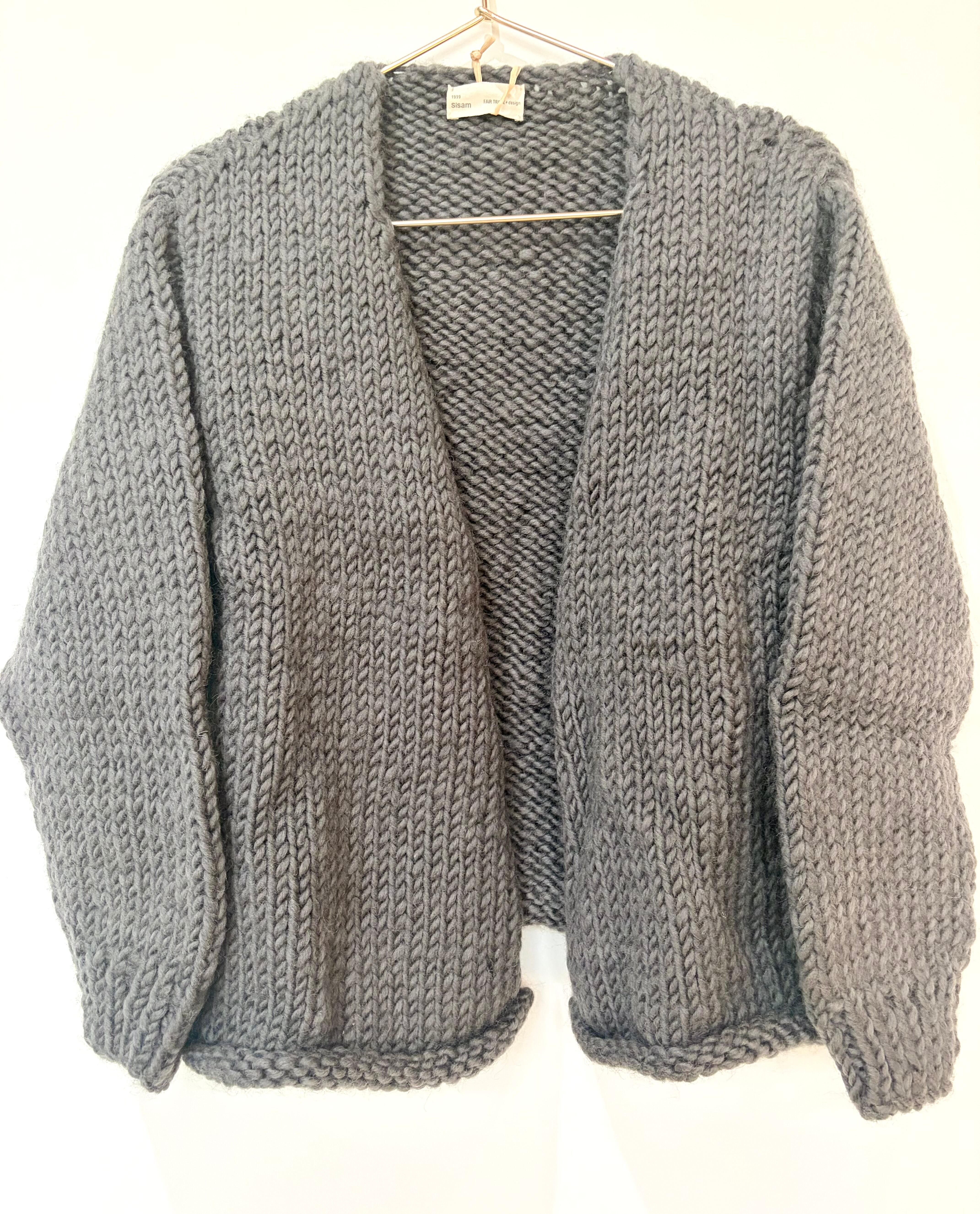 太い毛糸で編まれた、ボタンのない手編みカーディガン。