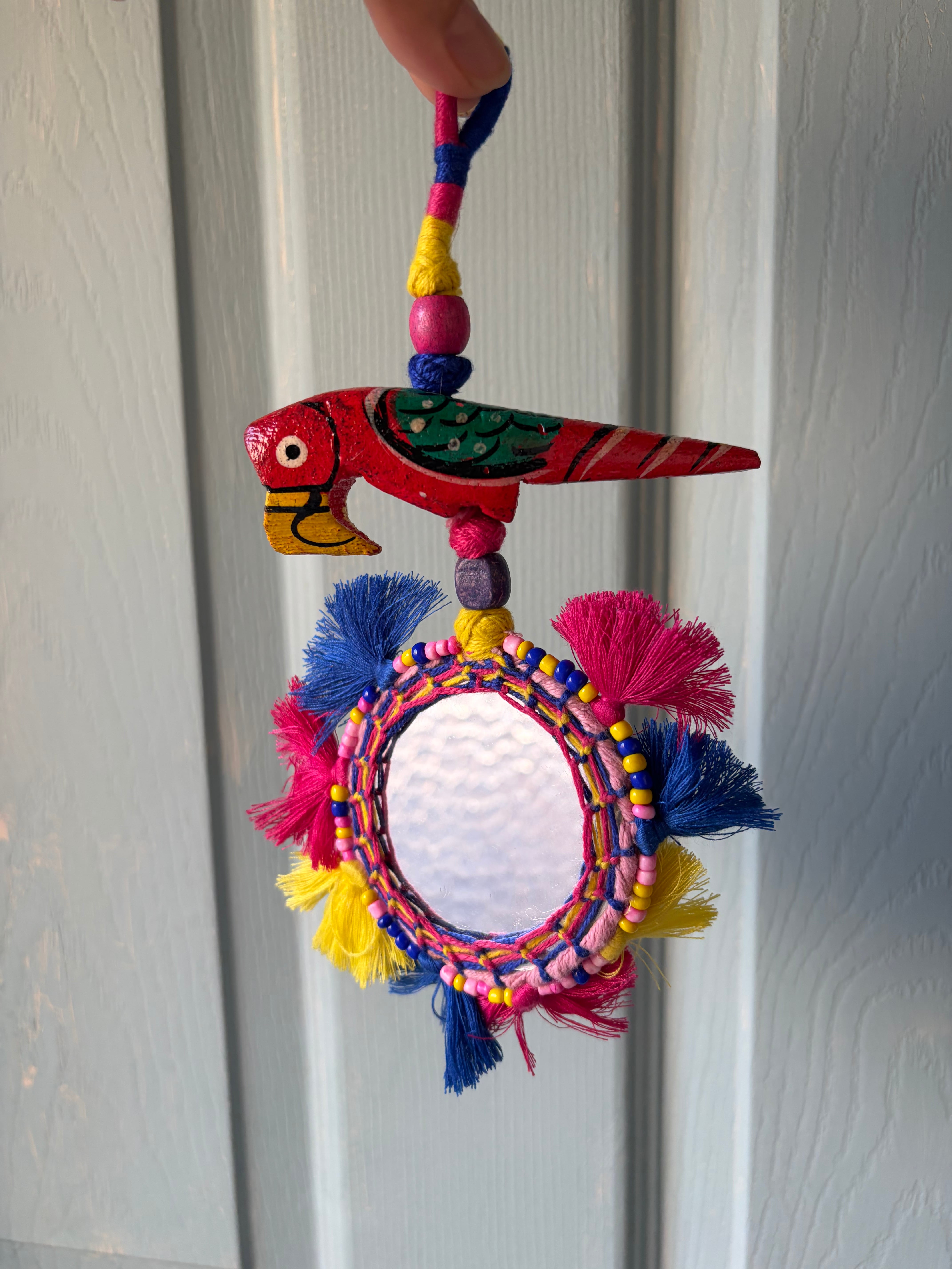 インド/ミラー飾りと鳥のハンギングオーナメント レッド